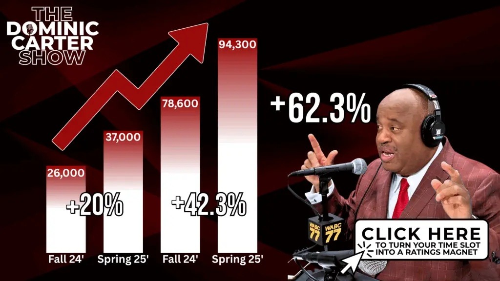 The momentum keeps building for Dominic Carter, the beloved talk show host on 77 WABC Radio. Ratings for The Dominic Carter Show have jumped an incredible 62%, proving that authenticity, passion, and perseverance still connect powerfully with audiences.